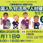 2026年2月13日 / 最終更新日時 : 2026年2月13日 saitama-kaigojinzai セミナー介護事業所向け経験交流会「外国人人材活用・人材確保」セミナー 開催日程 □開催時間 令和8(2026)年3月11日(水) 14:00~16:00(受付開始13:30) □会 場 さいたま市文化センター大集会室 □対象者 介護事業所の管理者、施設長、労務管理責任者 等 スケジュ […]